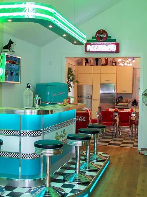 Por eso, y para no complicarte la vida y/o el bolsillo; aquí te decimos cómo replicar la decoración realmente atractiva y económica de los bares norte americanos de los años ’50. Una decoración que se grabó en nuestra historia, nuestra cultura y nuestros corazones; más que la ostentosa versión de los muebles franceses y europeos de la misma época.